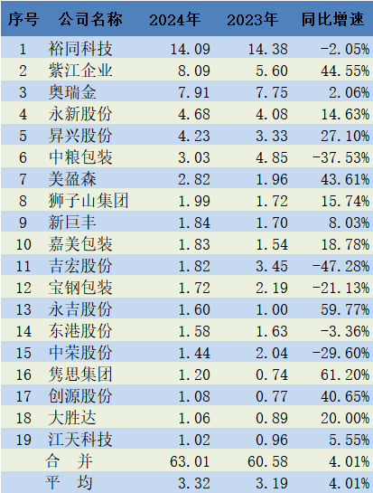 Jiamai Packaging, a tinplate can manufacturer, achieved revenue of 3.20 billion yuan, up 1.52% year on year; Zhongrong Shares, a leader in folding color boxes, achieved revenue of 2.782 billion yuan, up 7.30% year on year.